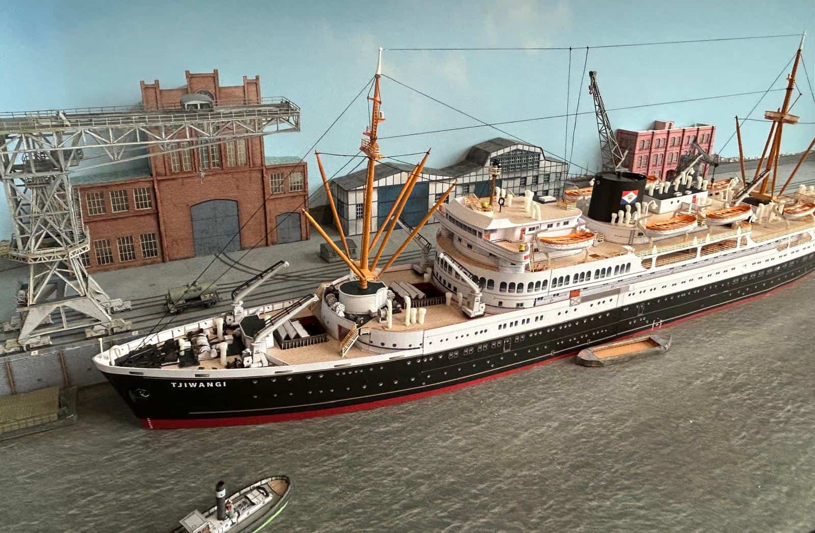 3) Ms Tjiluwah na de verbouwing in 1963: witte romp, deels gesloten zij-galerijen, 4 elek. kranen, 7 sloepen, deels (aangepaste) groene dekken en twee zwembaden.