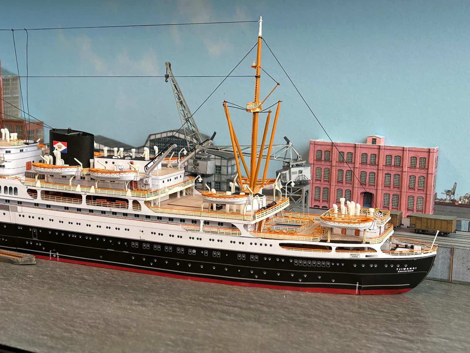 2) Ms Tjiwangi na de verbouwing in 1963: witte romp, deels gesloten zij-galerijen, 4 elek. kranen, 7 sloepen, deels (aangepaste) groene dekken en twee zwembaden.